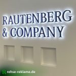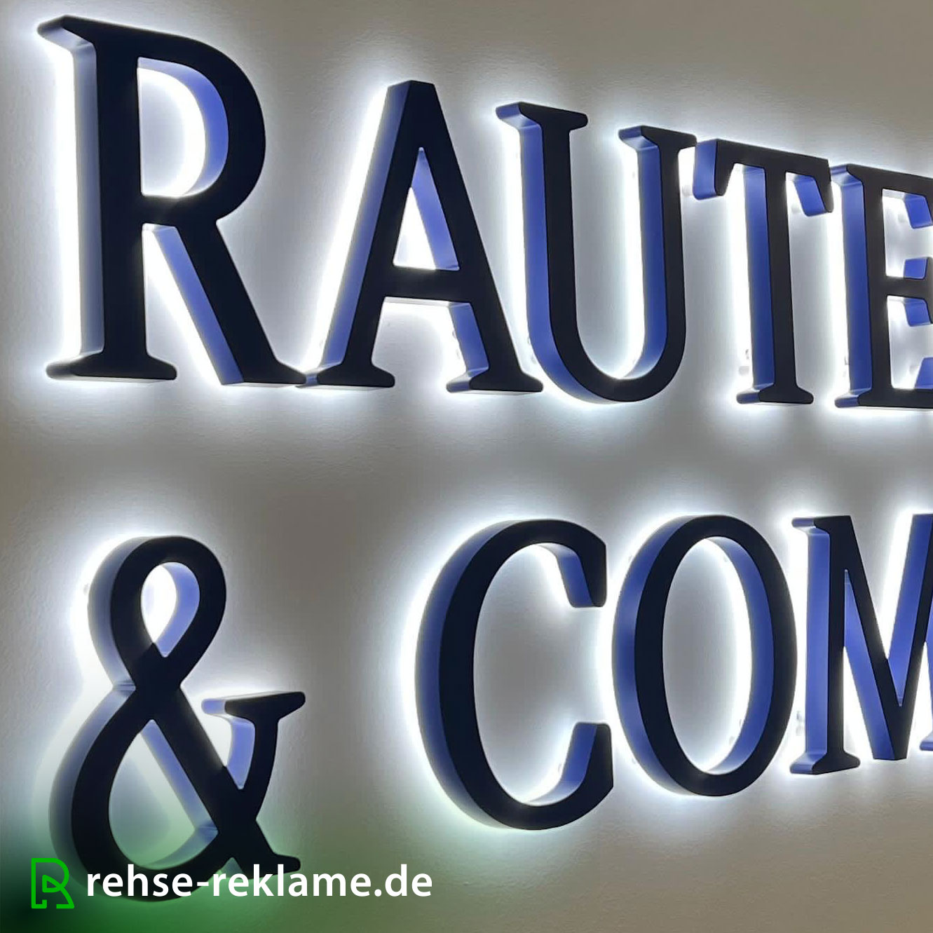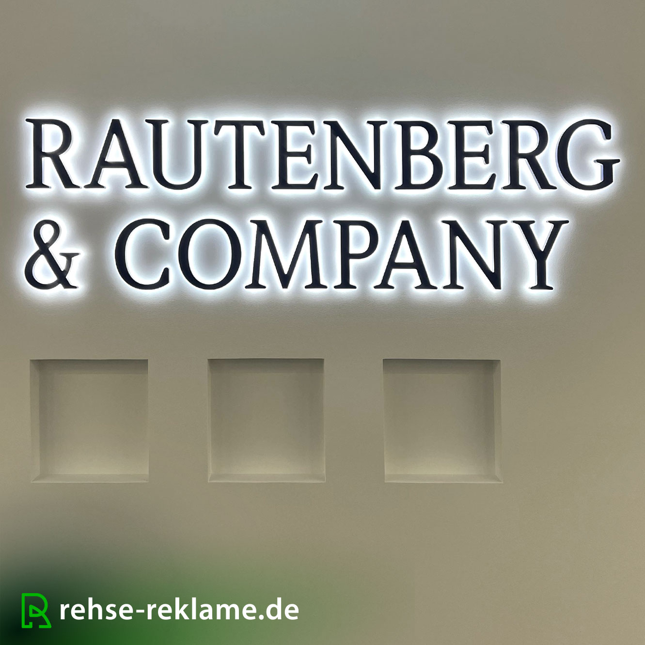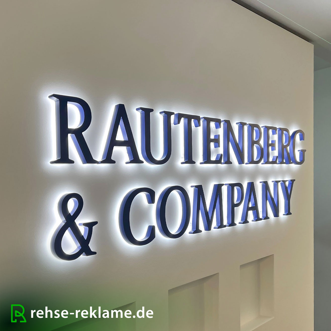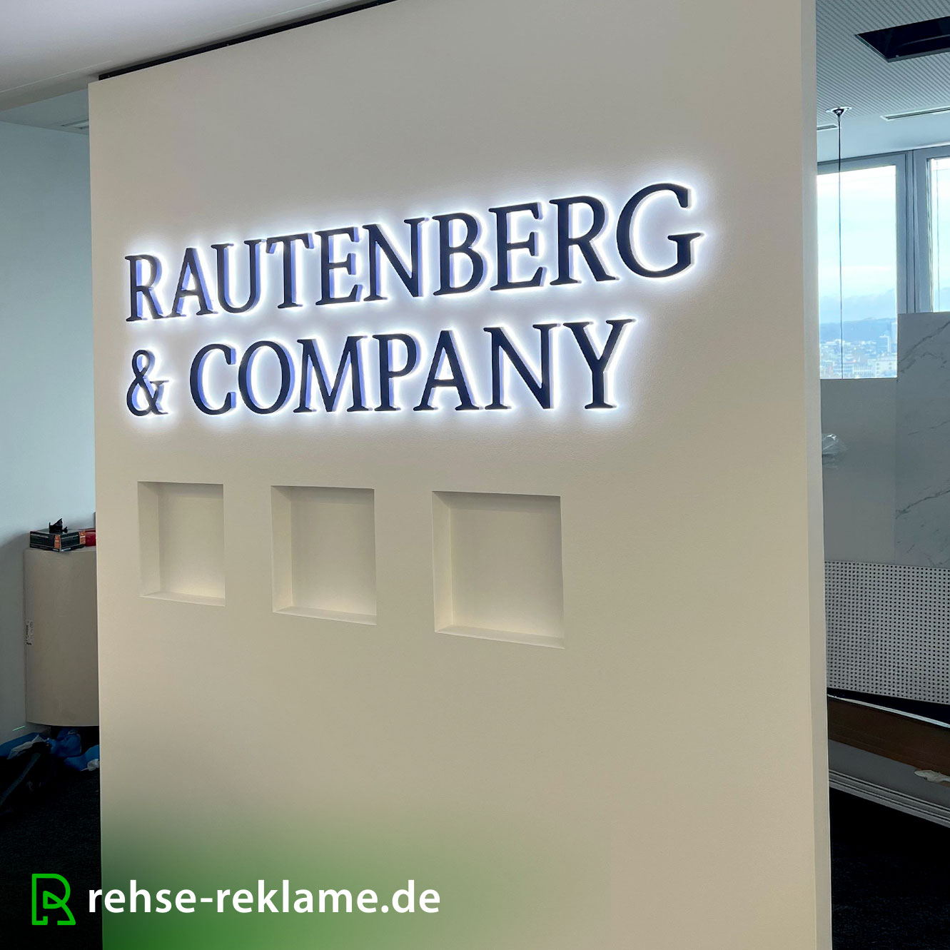 Für die Umsetzung dieser rückleuchtenden Buchstaben, haben wir uns für Vollacrylbuchstaben entschieden. Hierbei wurden die Fronten und Seiten im vorgegebenen Farbton lackiert un die LED-Module auf der Rückseite verklebt. Die Ausleuchtung erfolgt nach hinten durch energiesparende LED. Alle Buchstaben wurden mit Abstand an die Wand montiert – für einen schöne Lichtaura – und von hinten verkabelt. Das ist die ideale Lösung für den Markennamen im Büro: Clean, dezent und immer mit leuchtendem Markennamen.