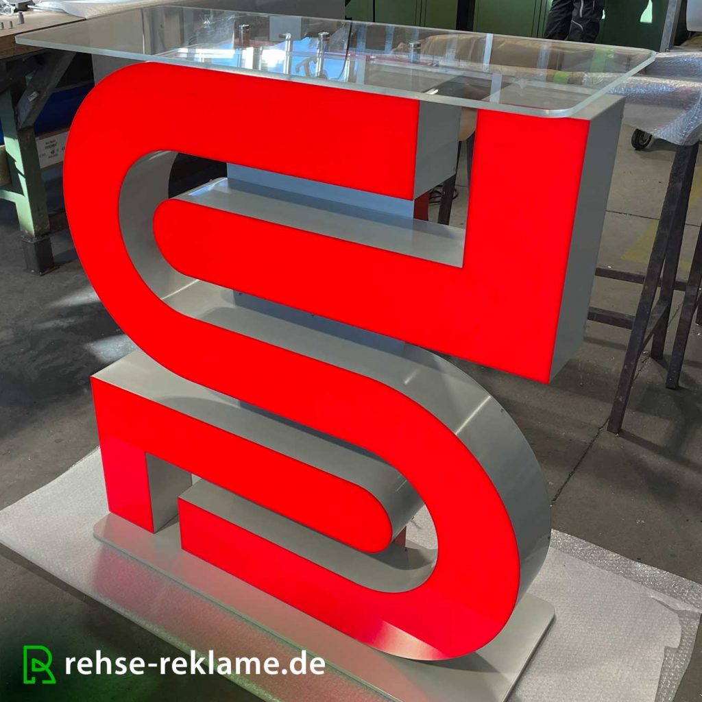 Logo aus Acrylglas als Rückleuchter am Empfangsbereich