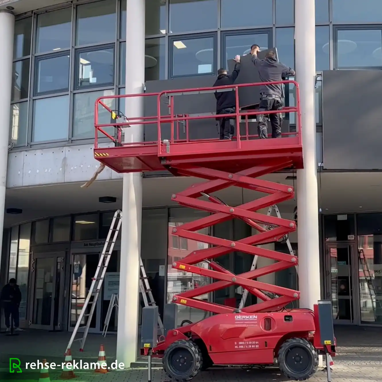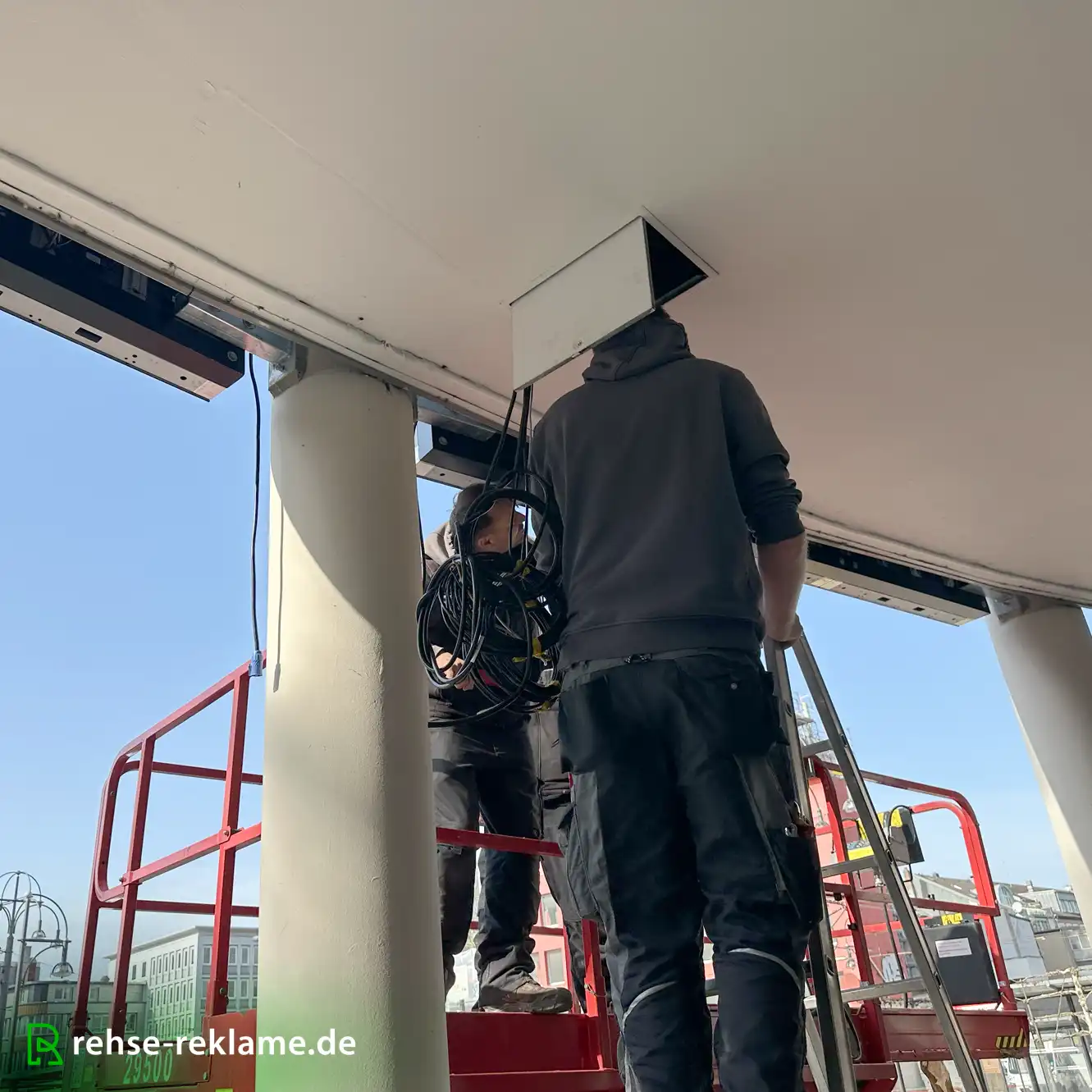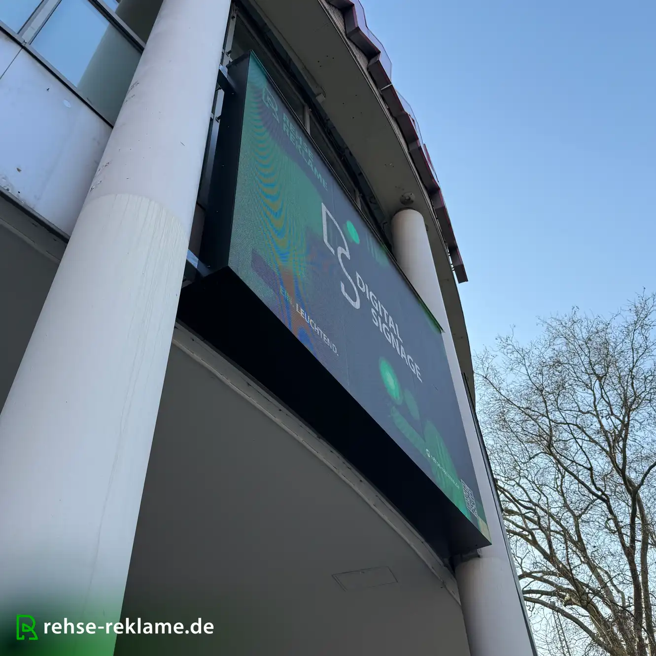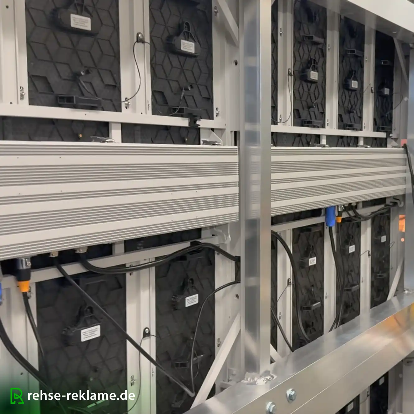 Die Installation erfolgte über eine speziell angefertigte Stahlrahmenkonstruktion, die zwischen bereits vorhandenen Betonsäulen montiert wurde. Diese Bauweise ermöglicht eine sichere und statisch stabile Befestigung der LED-Screens, ohne die bestehende Gebäudestruktur aufwendig verändern zu müssen.
