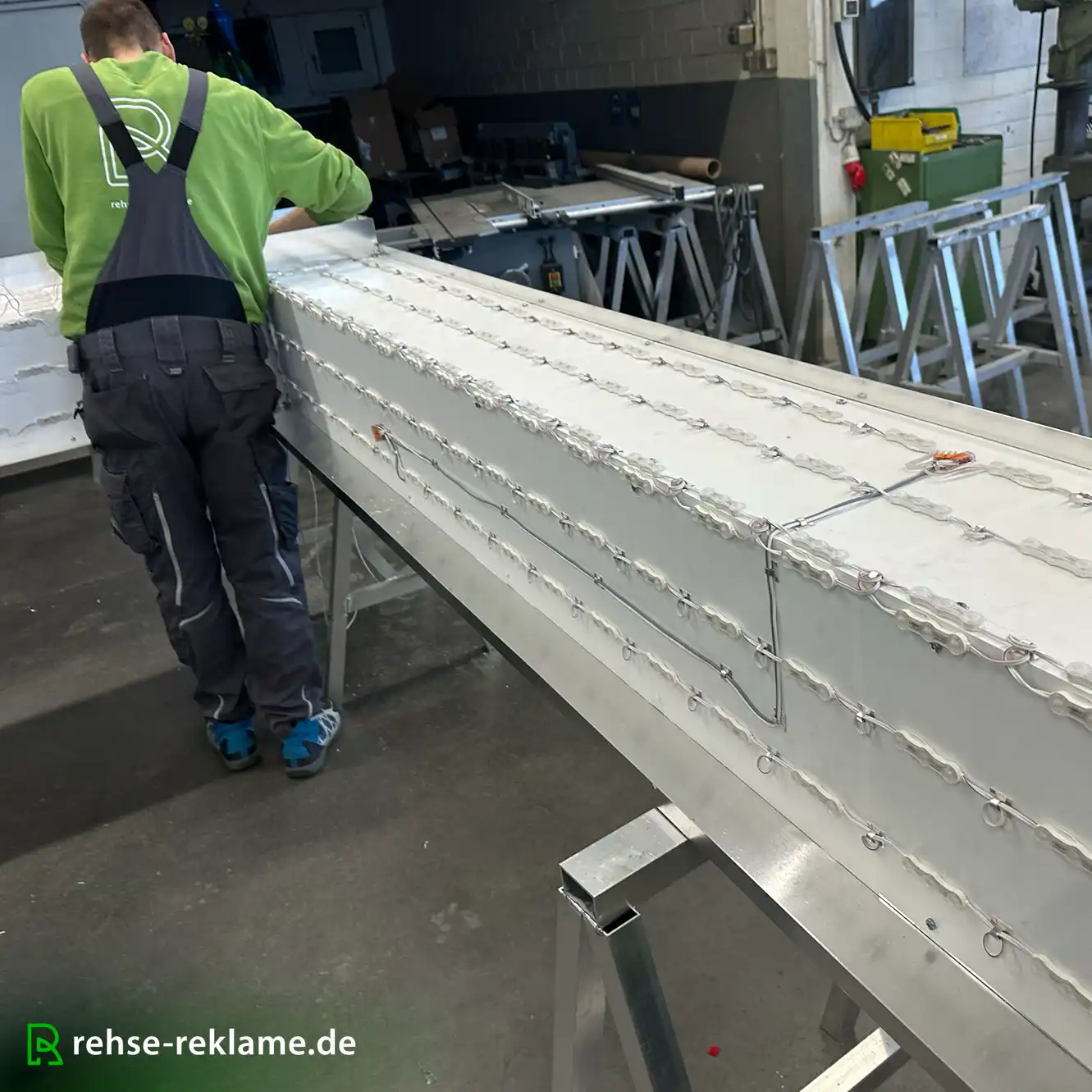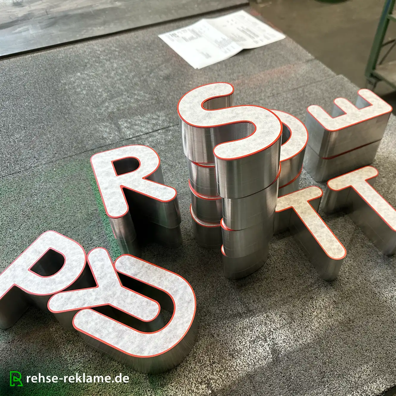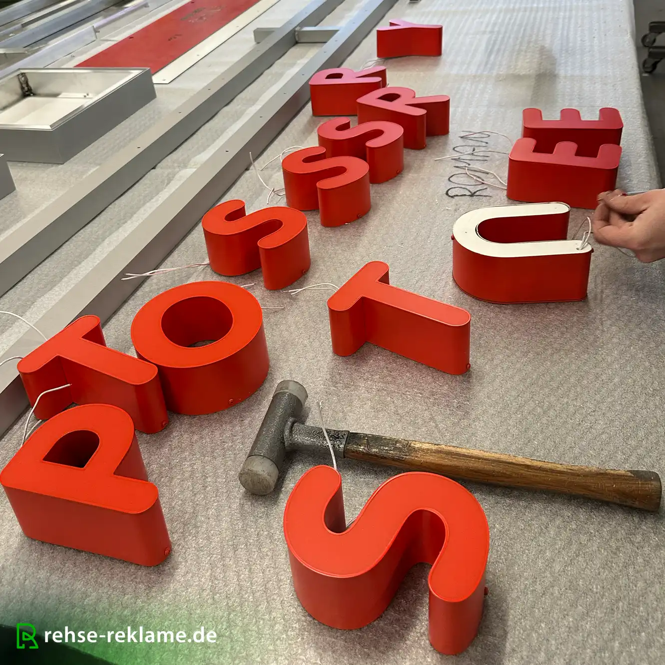 Ein weiteres Gestaltungselement ist die hochwertige Einzelbuchstabenanlage in B1-Frontleuchter-Ausführung. Die Zargen bestehen aus lackiertem Aluminiumblech im definierten RAL-Farbton, während die Front aus bündig verklebtem Acrylglas gefertigt wird.