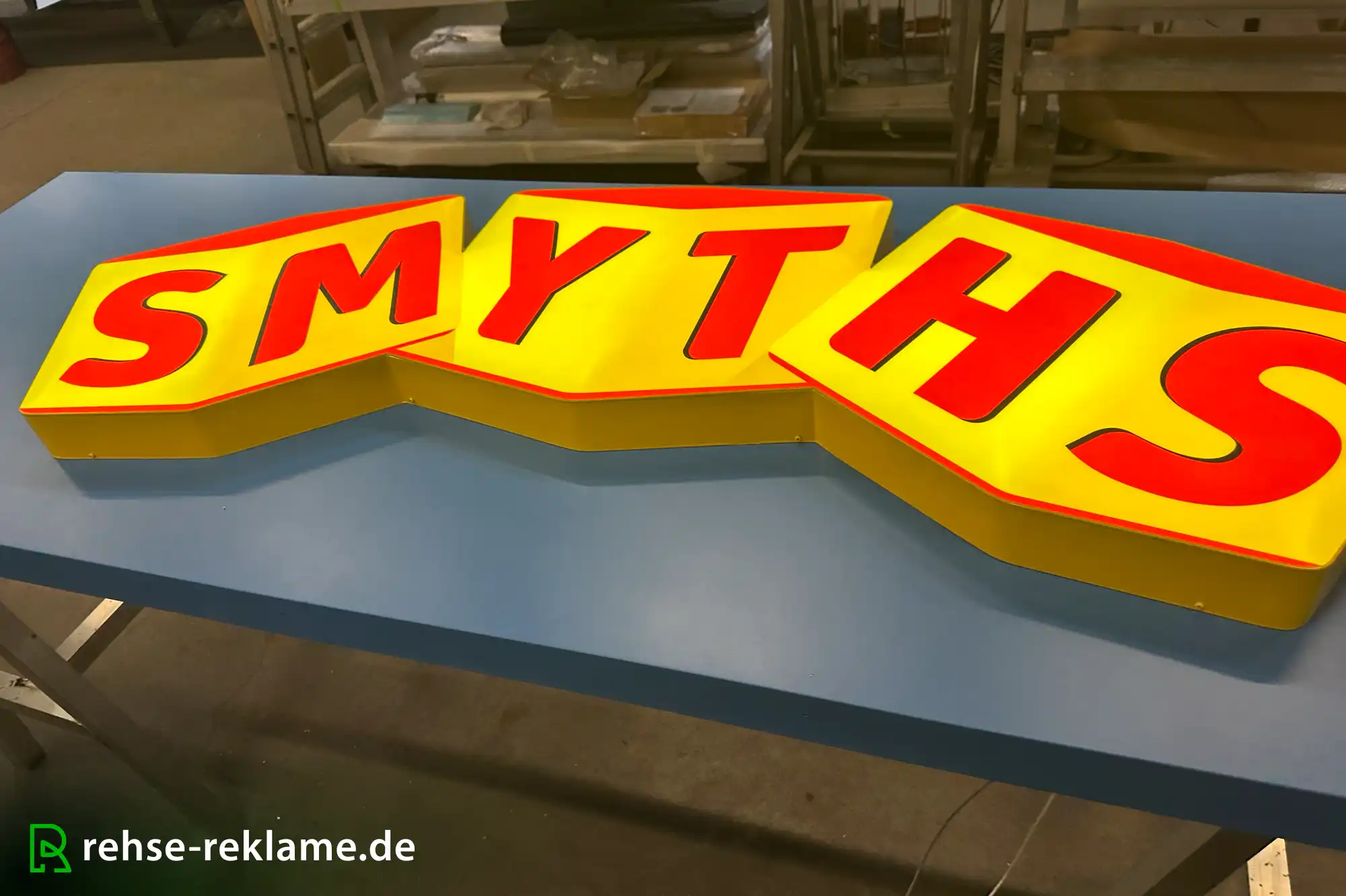 Zusätzlich verstärken ein aufgesetztes Logo sowie eine Einzelbuchstabenanlage in roter Frontleuchter-Bauweise die visuelle Wirkung. Mit einem Gesamtformat von ca. 4.700 x 3.200 x 400 mm entsteht ein imposanter und repräsentativer Eingangsbereich.